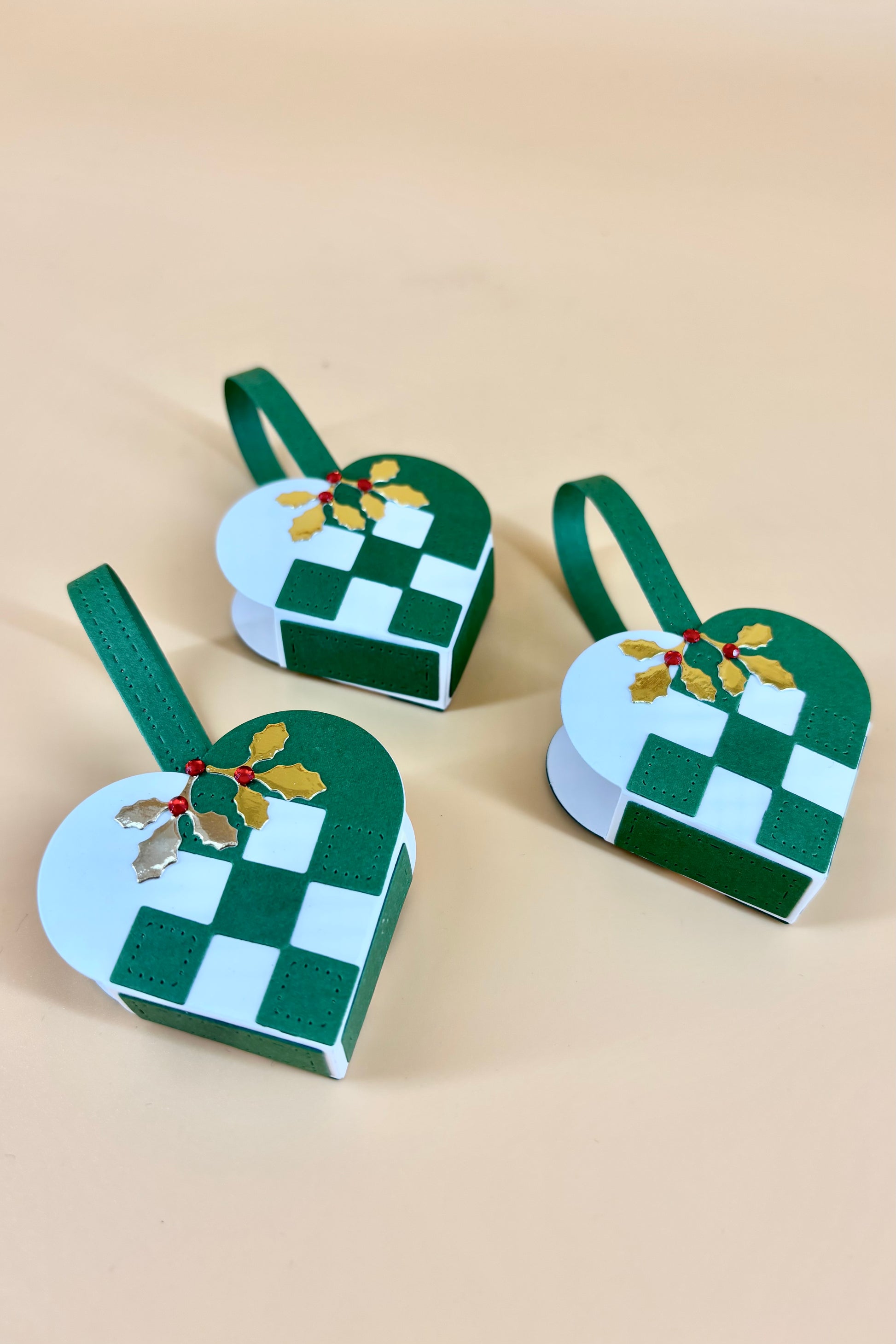 Smukke håndlavede julehjerter i klassisk dansk design. Hvert hjerte er 6 cm bredt og fremstillet i kraftigt karton med fine detaljer. Perfekte til at hænge på juletræet eller bruge som pynt på gaver. Sælges i sæt med 3 stk., så du nemt kan skabe hyggelig og stilfuld julestemning.