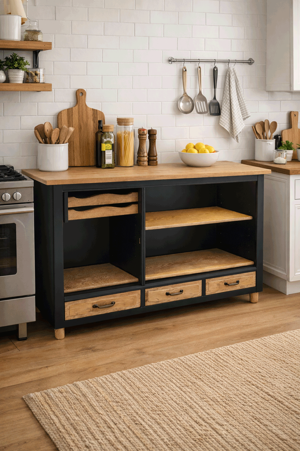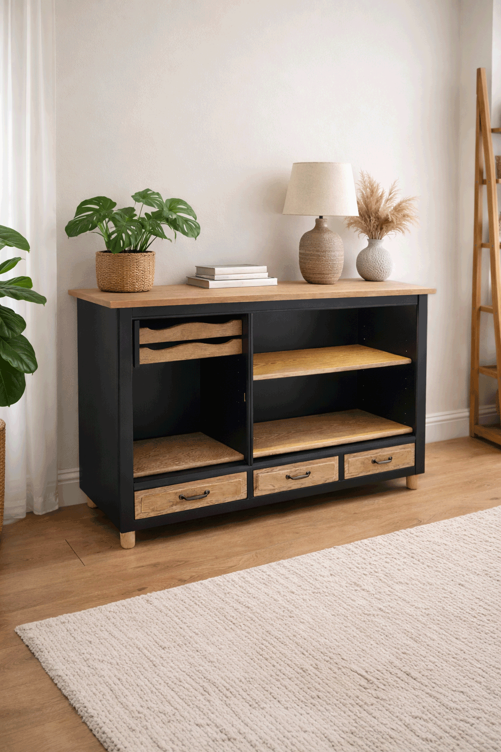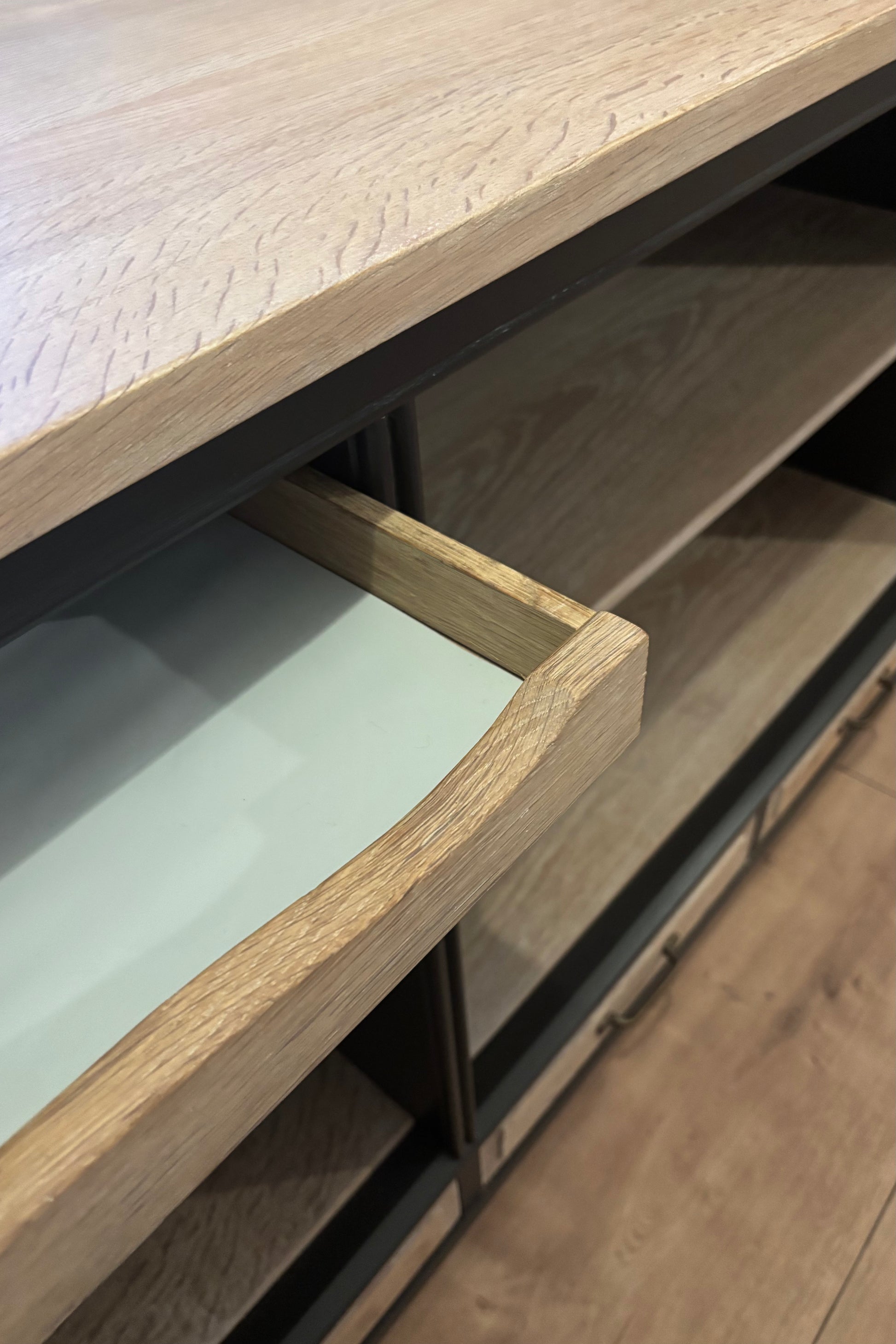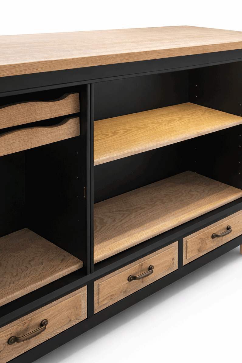 Skænken er nænsomt forvandlet fra en gammel egetræsskænk til en cool køkkenø. Den er malet i dæmpet sort, som passer ind i de fleste hjem. Træfladerne har fået en hvid olie, så de har et moderne og naturligt finish. Der er integreret lys i, så du kan se hvad du har på hylderne.
