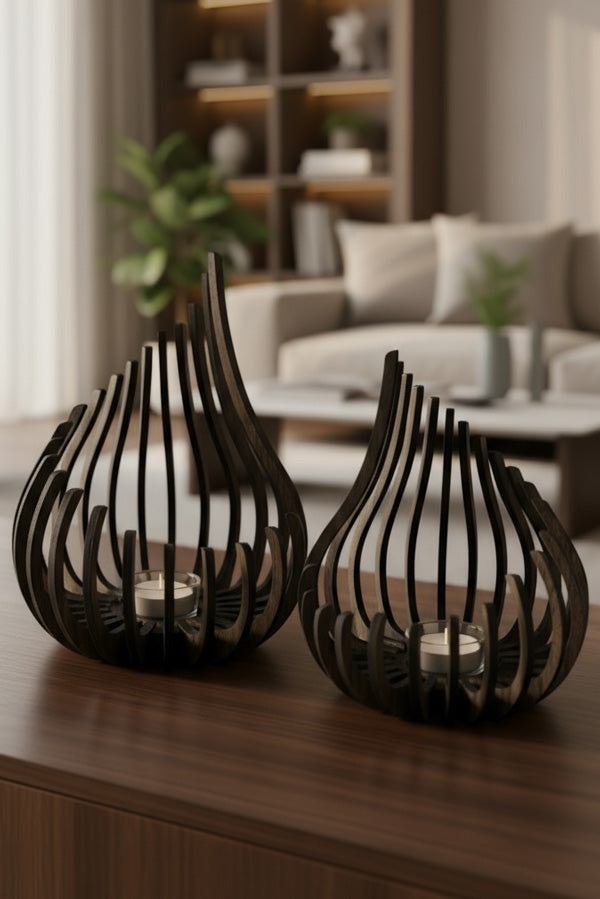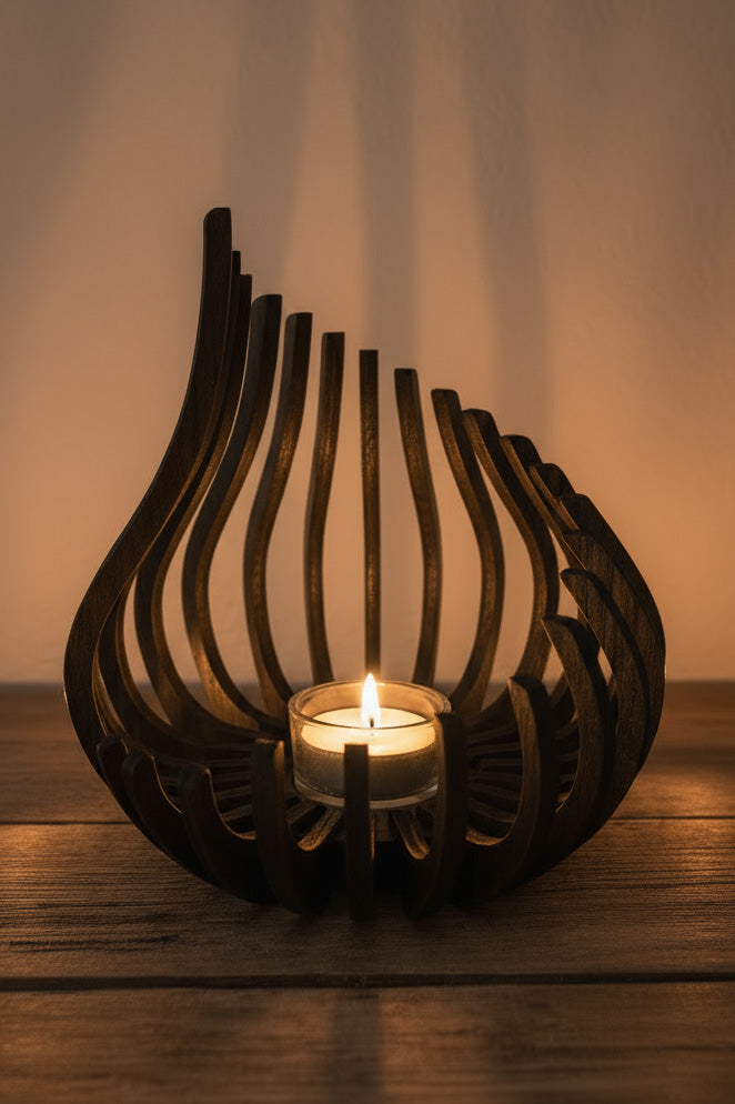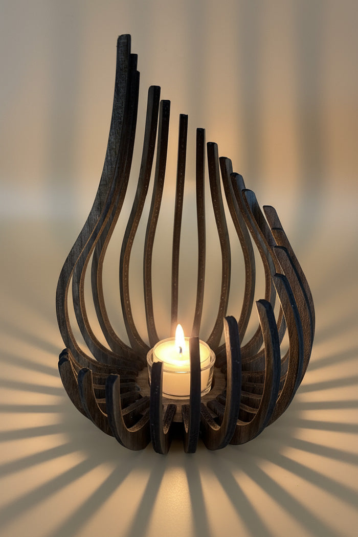 Glød lysestagen er lavet i mørkt valnøddetræ og giver et varmt skær – perfekt til vindueskarmen, spisebordet eller som gave. Hver stage er laserskåret og samlet med kærlighed, så du får et unikt stykke håndværk med masser af personlighed. Den har en lille glasstage der passer til et fyrfadslys. Lysestagen findes i to størrelser: Lille og stor. Du kan købe dem enkeltvis eller som sæt.